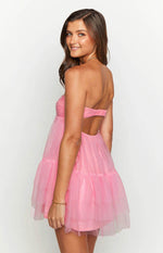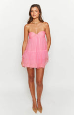 This beautiful pink mini dress is dreamy! Be the brightest at your party this summer. Its frilly detailing will pair perfectly with pink heels or pumps, while the knot front detailing perfectly pairs with cute hair bows.