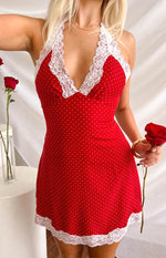 Our Cassidy Red Polka Dot Mini Dress is the perfect combination of sweet and seductive! This mini features an adjustable halter neck tie, lace detailing and vibrant red polka dots that add a hint of retro chic! Pair with some black boots and gold jewellery to dress it down, or swap for a pair of heels to dress up your look!