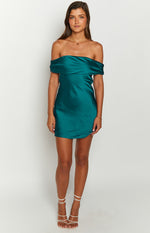 Teal Satin Off the Shoulder Mini Dress