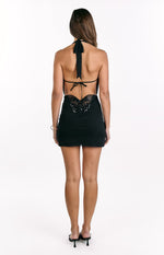 Step into sophistication with our Addison Black Cowl Neck Halter Mini Dress, perfect for your next party or date night. This mini features a low cowl neck, a refined halter neck tie, and a tie-up open back with a sequin butterfly detail. Pair this dress with strappy heels and a bold lip for a perfect party ensemble!