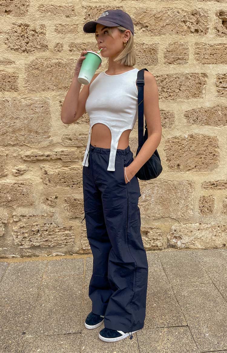 - Y2K in these navy cargo pants. Perfect piece for an everyday street look. Style with a crop and sneakers for ultimate comfort and style. Be sure to pop on sunnies and a bag to complete this fit!
