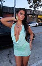 Bring the sparkle to your next party in our Charl Green Cowl Neck Mini Dress, designed for those who want to stand out. With its shimmering knit fabric and flirty halter neckline, this dress features a sultry low cowl neck and adjustable waist tie details. Pair it with strappy heels and statement earrings for the ultimate summer party look!