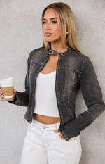 Meet your new favourite layer, the Corey Black Washed Denim Biker Jacket. Cut from stretch denim for a flattering, close-to-body fit, this jacket features classic panel detailing and a zip-front. Throw it over a mini dress or a crop top to add an instant edge to any look.