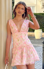 Exude effortless charm at your next summer day event in our Effie Pink Floral Mini Dress! Made from a lightweight chiffon, this feminine dress features a flowy skirt and a fitted waist panel to define your silhouette. Complete your style with simple sandals and a basket bag for a relaxed day out.