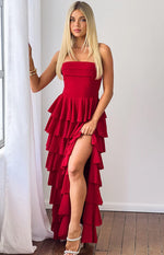Step into the spotlight at your next formal occasion in our Kim Red Strapless Ruffle Maxi Dress! This stunning gown is defined by its tiered ruffle maxi skirt and thigh split, creating a look that captures attention with every movement. For a timeless and elegant look, simply style it with gold jewellery and heels.