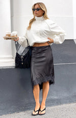 Discover the perfect blend of elegance and comfort with our Martha Black Satin Lace Trim Midi Skirt, an effortless staple for transeasonal dressing. Crafted from a smooth satin fabric, this flowing piece features an asymmetric hemline and delicate lace trim. Pair it with an oversized knit sweater and chunky boots for a cool-girl daytime aesthetic.
