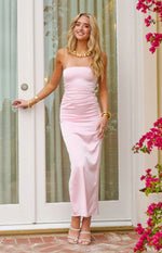 Pink Satin Strapless Midi Dress