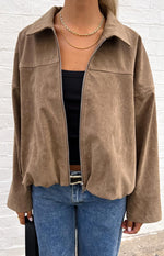 Our River Brown Suedette Bomber Jacket is the ultimate outerwear staple for a cool-girl take on effortless layering! Crafted from soft, luxe-feel suedette, it features a subtly structured silhouette with a bubble hem, classic collar, and relaxed fit for that model-off-duty appeal. Style it with a fitted crop top, jeans and pointed boots for a street-style ensemble that’s both refined and ready for anything!
