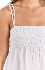 Elevate your everyday style with our Solei White Ruched Tie Strap Top, perfect for those breezy spring and summer days. This charming top features shirred bust detailing and adjustable shoulder straps with sweet tie accents, offering a playful yet polished look. Complete the ensemble with high-waisted denim and your favourite sandals for an effortlessly feminine vibe!