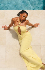 Our Stella Yellow Halter Cut Out Maxi Dress is the ultimate statement piece for summer festivals or a party. This striking dress features a halter neck tie with a gold ring detail, a daring front cut-out, and a sheer mesh skirt with a built-in bodysuit. Own the look by styling it with boots or strappy heels!
